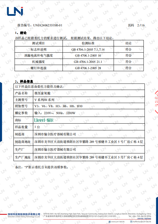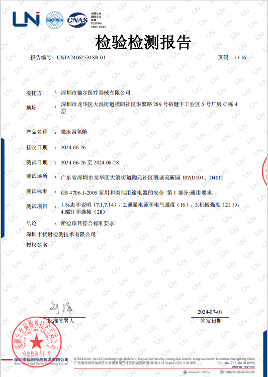 深圳市優(yōu)耐檢測技術(shù)有限公司根據(jù)國家標準GB4706.1-2005,對愉爾家用高壓氧艙進行了全面的安全性能測試。測試涵蓋了標志和說明、泄漏電流和電氣強度、機械強度以及螺釘和連接等多個方面。我們高興地看到,愉爾家用高壓氧艙在所有測試項目中均符合標準要求,展現(xiàn)了其卓越的安全性能。